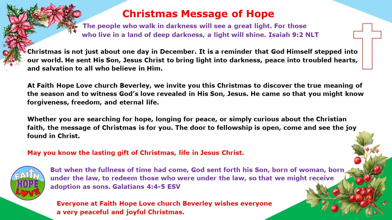 Faith Hope Love church Beverley is an independent church walking in obedience to Jesus Christ, not the traditions of man.